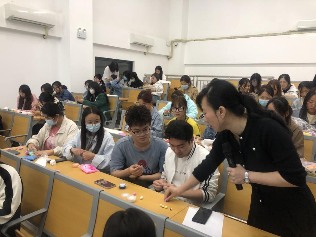 岳琦结合自己二十多年的从教经历,从“借形想象”的定义出发,介绍了幼儿园美术教育活动开展的前沿理念,结合丰富的幼儿美术作品,从借助色块、不规则形状、线条、撕纸剪纸、文字字母、图片、立体造型、组合创造等八个方面详细讲解示范了“借形想象”的基本原理和技法,并指导学生利用泡泡泥、马克笔、纸张等材料,现场进行创作实操。岳琦老师精心的准备、精彩的分享、耐心的指导赢得了在场同学们的阵阵掌声。