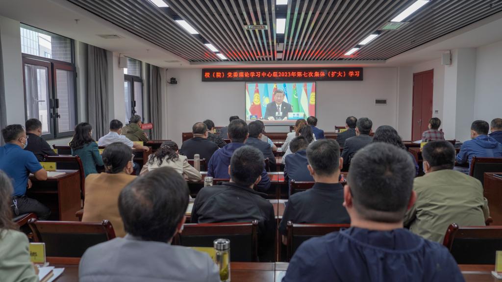 5月25日,校(院)举行党委理论学习中心组2023年第七次集体(扩大)学习,党委书记温锋科主持学习,党委班子成员、副处(含助理)以上干部以及协助部门主要负责人工作人员参加。