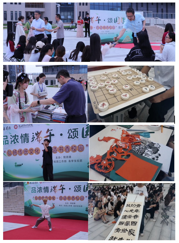 6月20日,院团委联合图书馆、后勤服务管理中心在长安校区图书馆广场前举办品浓情端午、颂国学经典,传统文化展演活动。副院长韩凯军出席,学工部(学生处)部(处)长祁志、图书馆馆长刘延民、团委副书记薛江泉及300余名学生参加。