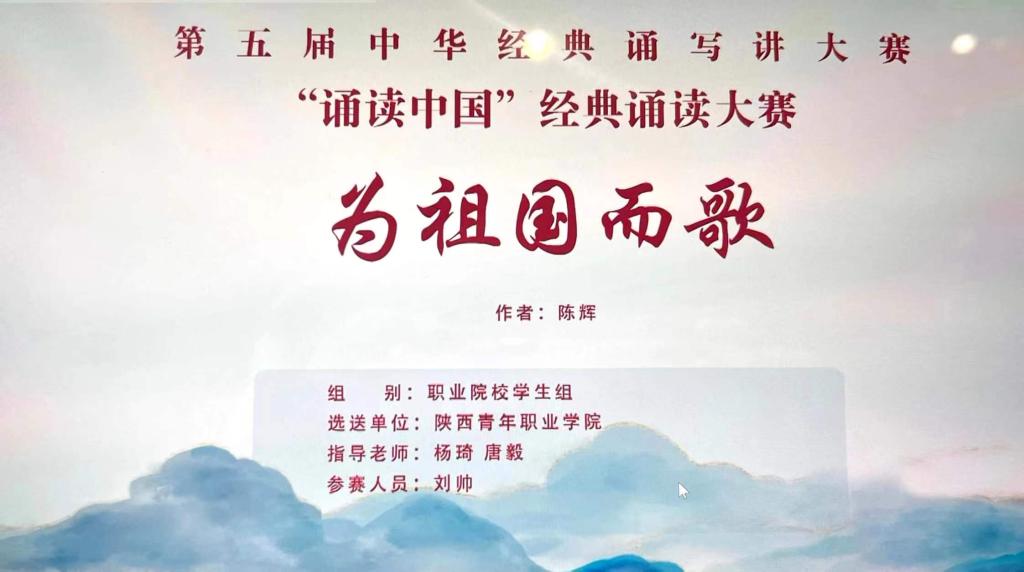 近日,第五届中华经典诵读写讲大赛(陕西赛区)获奖名单公示,由文化传媒系教师杨琦、唐毅指导,播音主持专业学生刘帅诠释的诵读作品《为祖国而歌》荣获“诵读中国”经典诵读大赛一等奖。