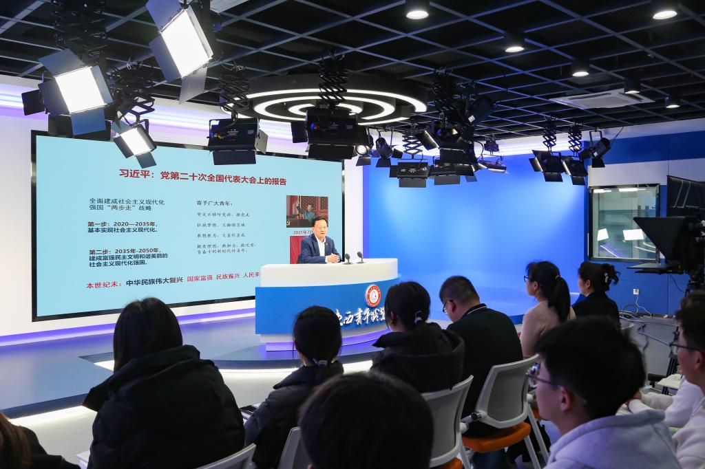 11月13日,校(院)党委书记温锋科在长安校区文化传媒系录播室为2021-2022级全体学生讲授专题思政课。文化传媒系党总支书记、副主任王瑜及教学工作负责人杜小峰,马克思主义学院直属党支部书记、院长马雅玲,团委书记王珊,形势与政策教研室主任陶涛及30名学生代表在主会场听课,约5000余名学生、辅导员在教师及线上聆听收看。