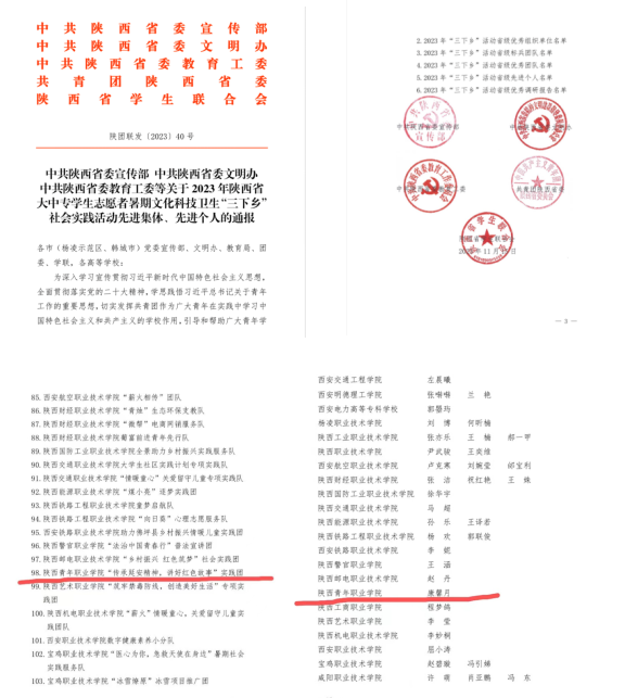 日前,全省2023年大学生“三下乡”暑期社会实践活动评选工作圆满结束。由我院团委副书记薛江泉指导,交通运营服务系辅导员康馨月、文化传媒系辅导员韩倩参与,刘畅、张雨寒、申紫怡、李依霆、赵朝旗、李妍、李媛媛、温聪慧等13名同学参加的“传承延安精神,讲好红色故事”社会实践团获得陕西省“优秀团队”,康馨月获评“优秀个人”荣誉称号。