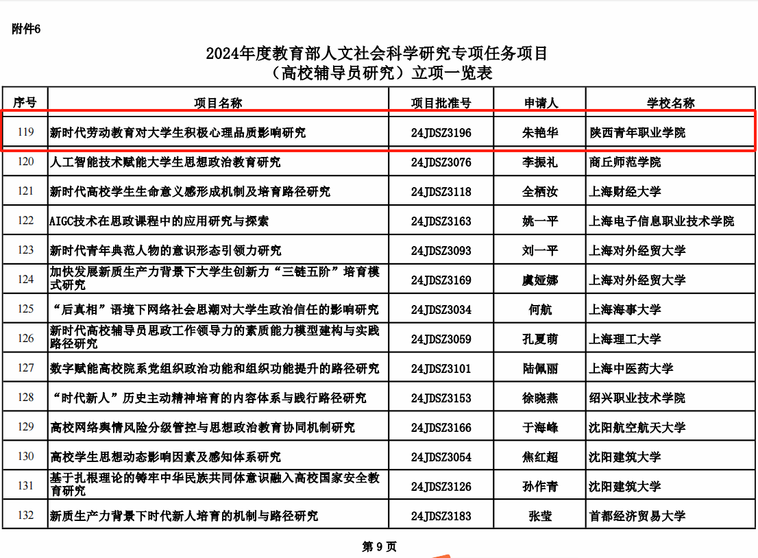 近日,由教育部社会科学司组织的2024年度教育部人文社会科学研究专项任务项目(高校辅导员研究)立项结果正式公布,BEAT365辅导员朱艳华申报的项目《新时代劳动教育对大学生积极心理品质影响研究》获批立项。