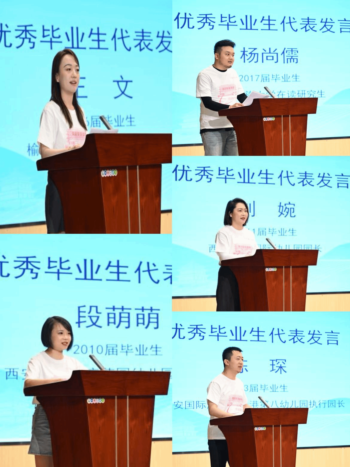 优秀校友代表段萌萌、王文、刘婉、杨尚儒、陈琛分别从幼儿园管理者、一线教师、自主创业、学业深造及男教师职业发展的视角分享了自己毕业后的工作经历与人生感悟。