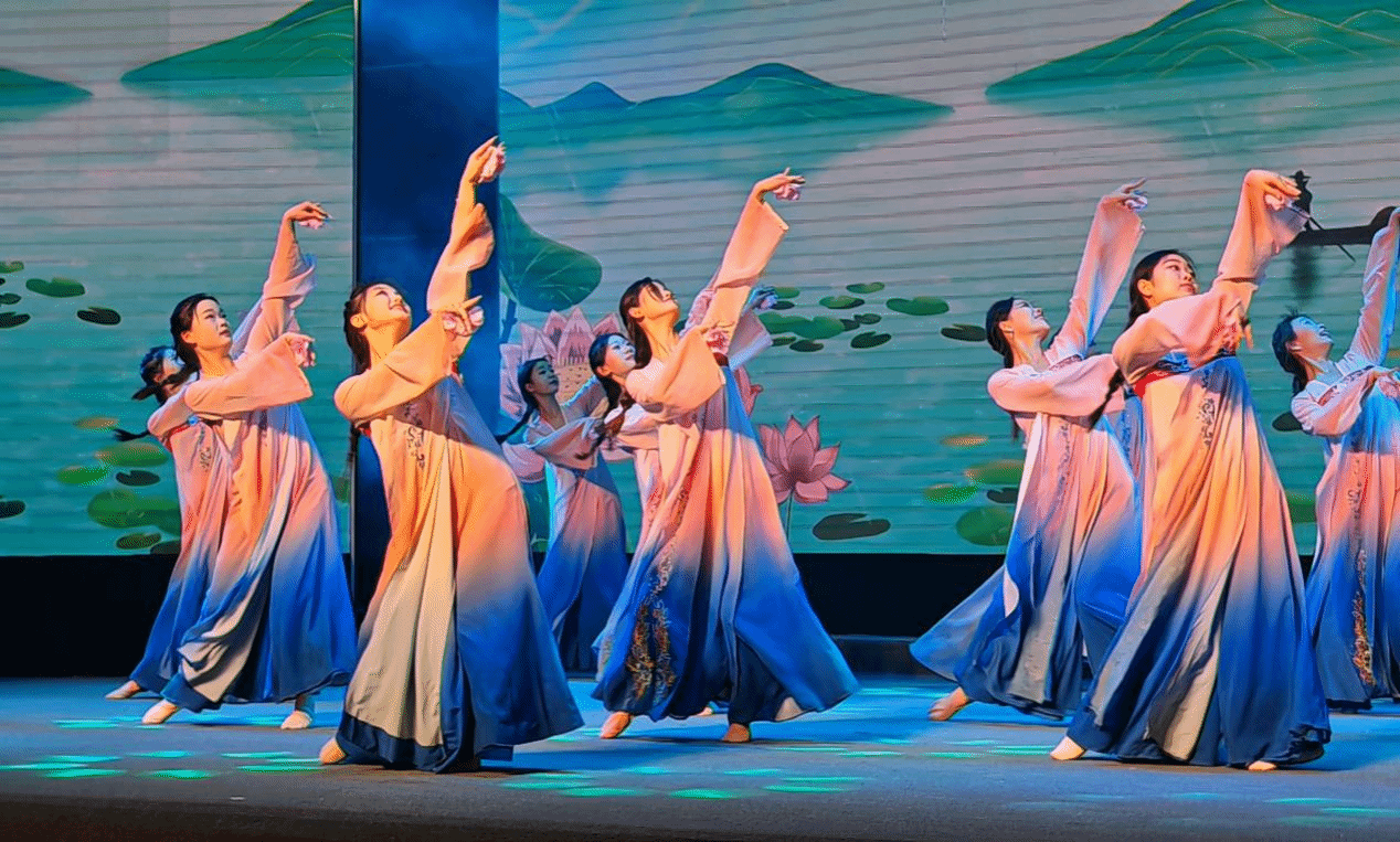 学生们身着华美的传统服饰,手持绢花,以轻盈曼妙的舞步、婉约灵动的身姿,将古典舞的韵味与簪花文化的雅致完美融合,为现场观众带来了一场视听盛宴,展现了新时代青年学子的艺术素养与青春风采。观众们沉浸其中,掌声不断。
