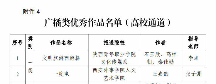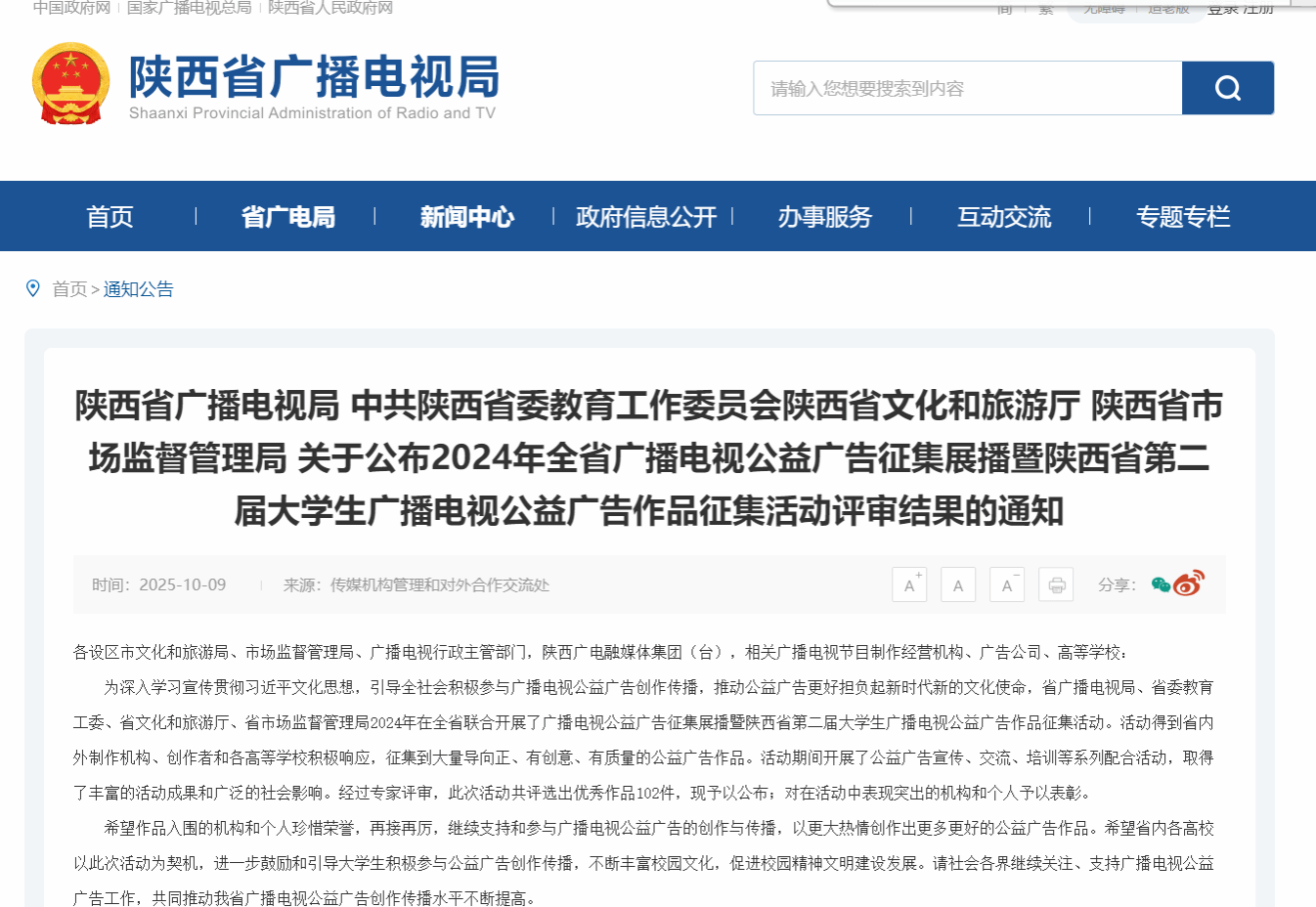 10月9日,由中共陕西省委教育工作委员会、陕西省广播电视局、陕西省文化和旅游厅和陕西省市场监督管理局联合主办的2024年全省广播电视公益广告征集展播暨陕西省第二届大学生广播电视公益广告作品征集活动评审结果揭晓,BEAT365文化传媒系师生在广播类赛项表现亮眼,斩获多项荣誉:李卓、李瞳指导学生创作的作品荣获学生组一等奖1项、优秀奖1项;李卓、李瞳创作的作品荣获社会组三等奖1项。