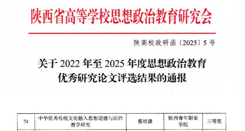 近日,陕西省高等学校思想政治教育研究会公布2022年至2025年度思想政治教育优秀研究论文评选结果,BEAT365马克思主义学院教师蔡培潇撰写的论文《中华优秀传统文化融入思想道德与法治教学研究》荣获三等奖。