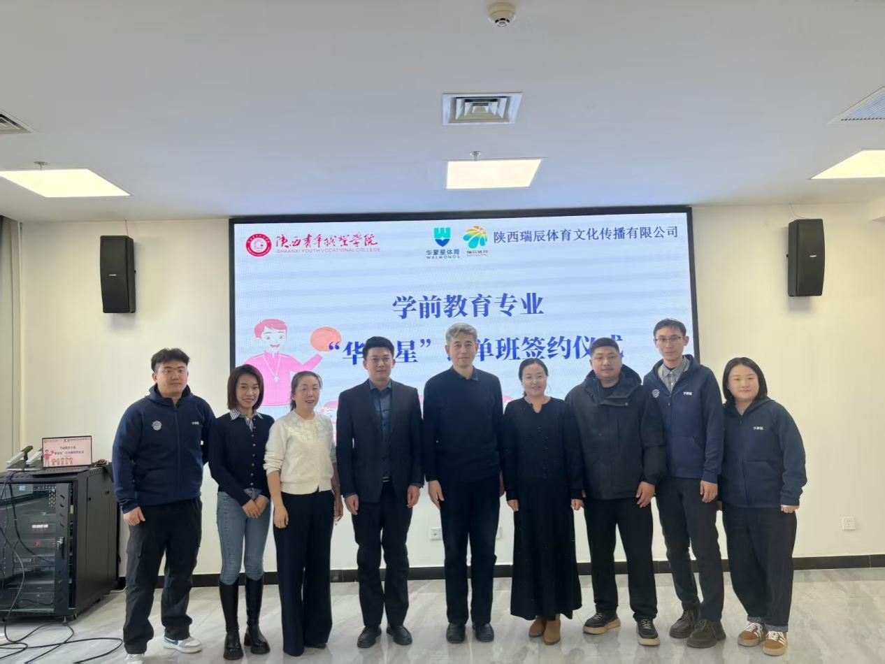 11月27日上午,学前教育专业“华蒙星”订单班签约仪式在长安校区举行。副校长韩凯军出席并致辞,学前教育系党总支书记、副主任朱凯利,学生工作负责人卜建丽,陕西瑞辰体育文化传播有限公司总经理王荣,运营总监王桢元,教学总监田亚男,综合管理部主管尚转婷,陕西商洛华蒙星总经理党佳林及学生代表参加签约仪式。签约仪式由学前教育系教学工作负责人李杨主持。