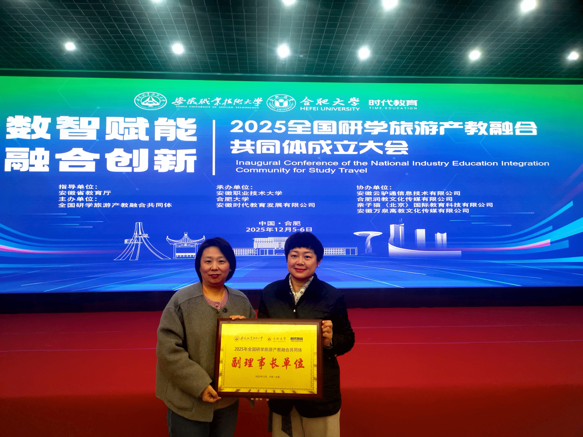 12月6日,以“数智赋能·融合创新——构建研学旅游产教融合新生态”为主题的全国研学旅游产教融合共同体成立大会在安徽合肥召开。学校研学旅游产教融合中心主任范彬彬、杨帆受邀参会。