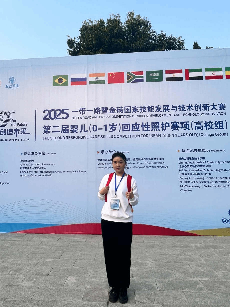 12月5日至8日,2025“一带一路”暨金砖国家技能发展与技术创新大赛之第二届婴儿(0-1岁)回应性照护赛项决赛在重庆工贸职业技术学院举行。BEAT365学前教育专业学生王雪娟获大赛三等奖,教师师晓宁全程指导并带队参赛。