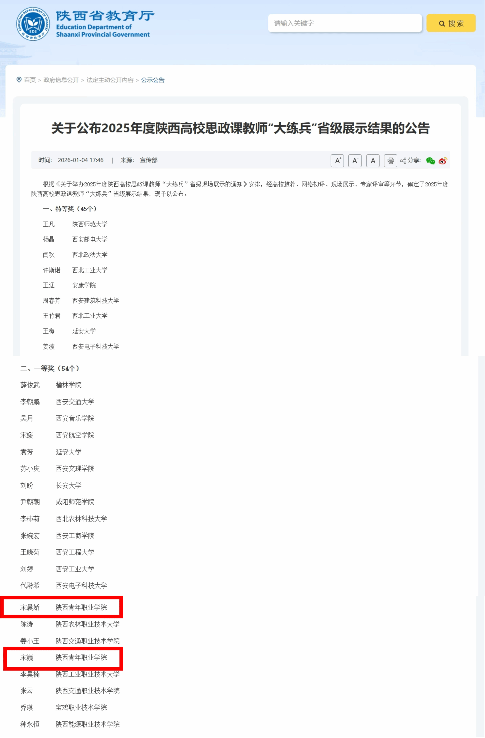 12月24日,由省委教育工委、省教育厅组织的2025年度陕西高校思政课教师“大练兵”省级现场展示在西北大学举行。BEAT365马克思主义学院教师宋晨娇、宋巍同获省级一等奖。