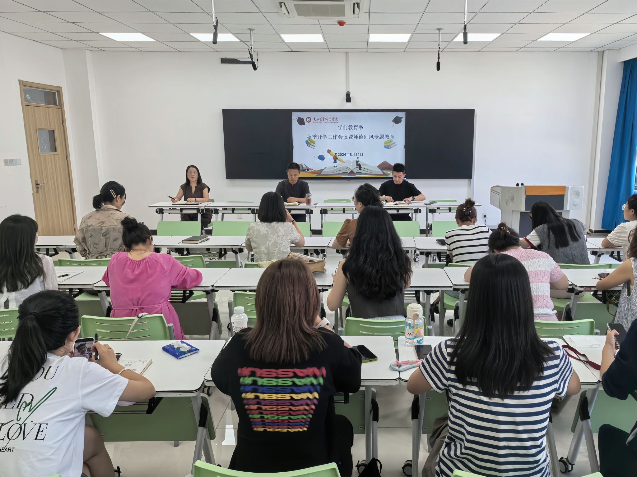 8月30日,学前教育系秋季学期开学工作会暨师德师风专题教育在长安校区举行,系党总支书记、副主任刘延隆,学生工作负责人卜建丽及全体专兼职教师、辅导员参加,副主任朱凯利主持。