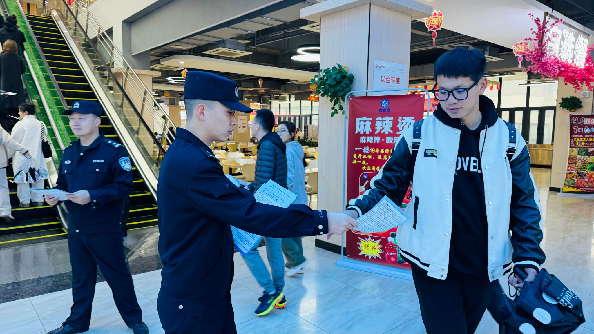 随后,民警和保卫处工作人员来到学校餐厅开展宣传活动。通过发放《致长安区高校师生的一封信》等宣传资料、现场互动答疑等形式,向广大师生介绍了反电诈相关知识。重点向学生讲解了兼职刷单、代办信用卡、冒充网购客服、冒充公检法、冒充熟人领导、虚假服务和投资理财等7类常见校园诈骗手段,使学生认识到电信诈骗的严重后果。