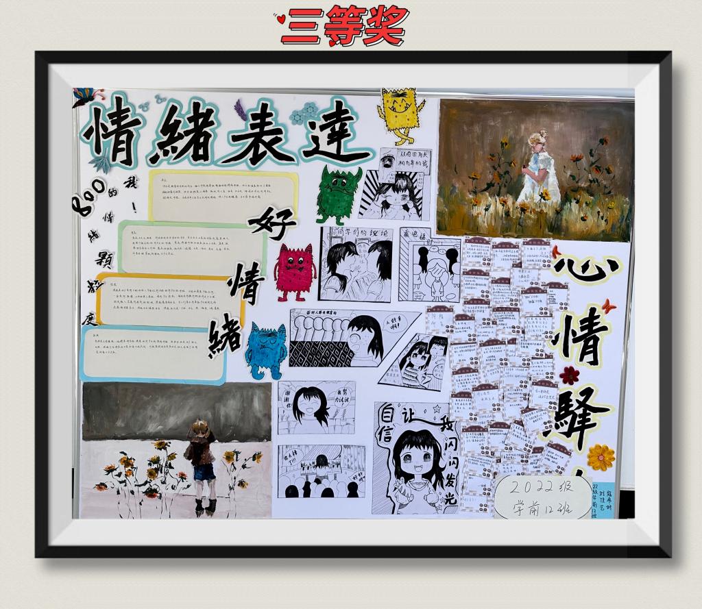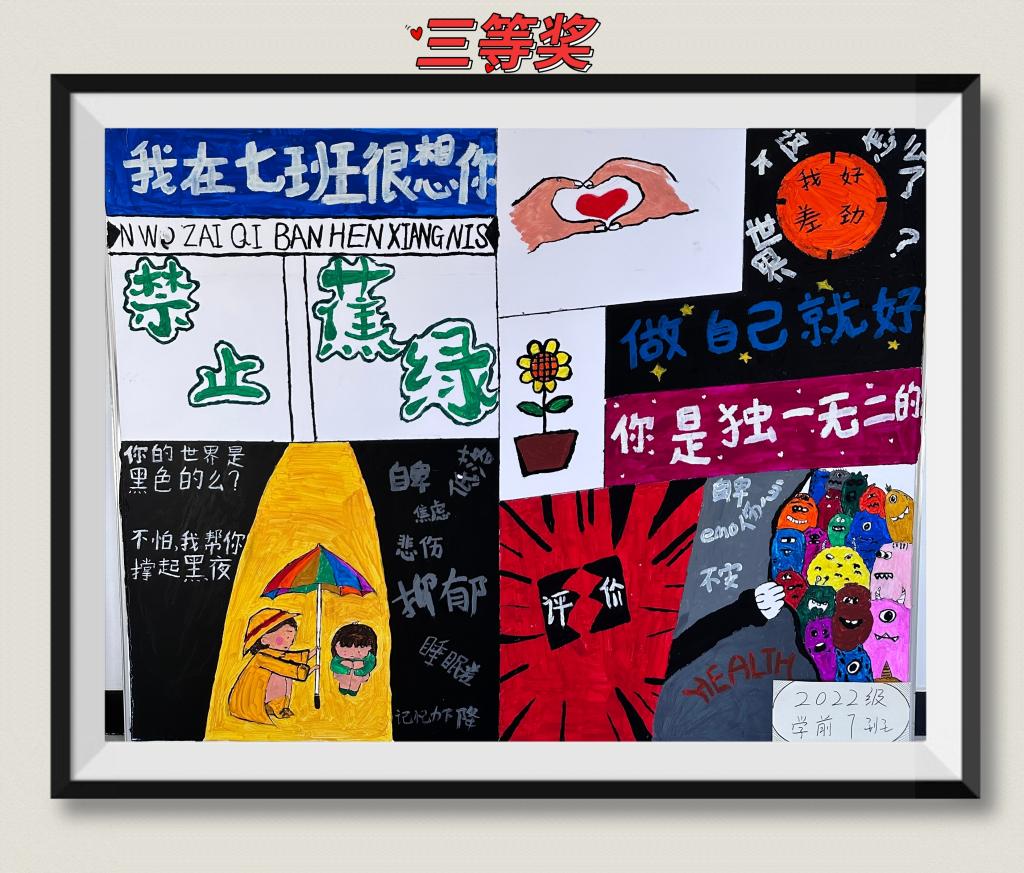 2022级学前教育专业共计15个班级参与本次活动,心理角创建活动内容涵盖广泛,主要有悦纳自我、情绪表达和管理、心理健康小贴士、生命的意义等心理健康知识。经过指导老师和班级学生代表共同评选,2022级学前教育专业3班作品获得一等奖;2022级学前教育专业15班等3个班级获得二等奖;2022级学前教育专业7班等5个班获得三等奖。