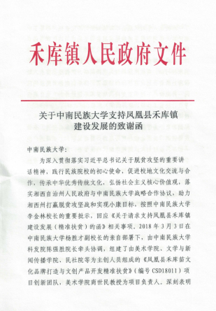 为深入贯彻落实习近平总书记关于脱贫攻坚的重要讲话精神,践行民族院校的初心使命,促进校地文化交流与合作,传承中华优秀传统文化,弘扬社会主义核心价值观,落实beat365官网与湘西自治州人民政府战略合作协议,助力湘西州打赢脱贫攻坚战和实现小康目标,按照李金林校长的重要批示,回应《关于请求支持凤凰县禾库镇建设发展(精准扶贫)的函》相关事项,2018年3月初,杨胜才副校长亲自安排部署,科发院陈强胜院长牵头协调,组建了由美术学院、文学与新闻传播学院、民族学与社会学学院、公共管理学院、经济学院等为主创人员组成的创新团队,并确定了《凤凰县禾库苗文化品牌打造与文创产品开发精准扶贫》(编号CSD18011)项目立项,美术学院商世民教授为项目负责人。