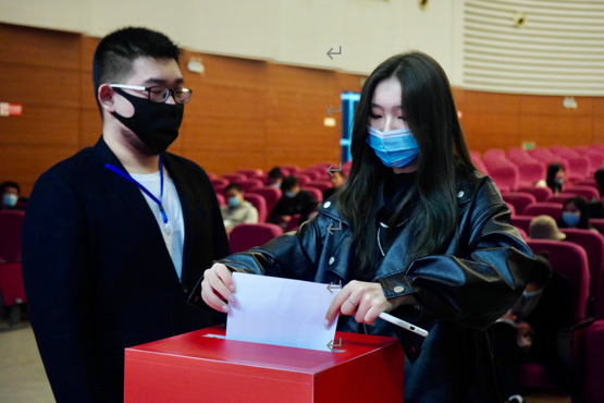 接下来,王海涛老师宣读本次大会《选举办法》,在主持人介绍2018届主席团候选人后,全体学生代表进行投票选举。最终,第十二次学生代表大会选举产生了刘彧怡、王一童、高敏3位同学为美术学院2018届主席团成员。