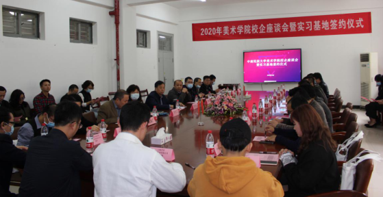 10月30日下午2:30,美术学院校企座谈会暨实习基地签约仪式于12A-110会议室召开,校党委常委、副校长杜冬云,研究生院院长何冬兰,招生与就业处处长舒服明,教务处副处长李立及美术学院领导班子成员、有关专业教研室主任参加会议。会议由美术学院院长吴海广主持,参加签约授牌仪式和业界导师聘任仪式的企业代表受邀出席。