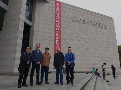 随后,任惠中教授一行在吴海广院长的陪同下,参观了美术学院的12号教学楼、美术学院国家级实验中心和民大光谷美术馆,并在美术馆前合影留念。