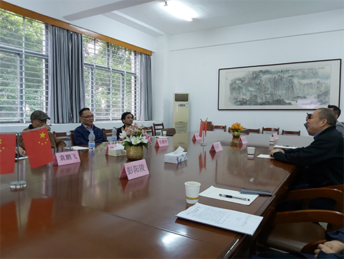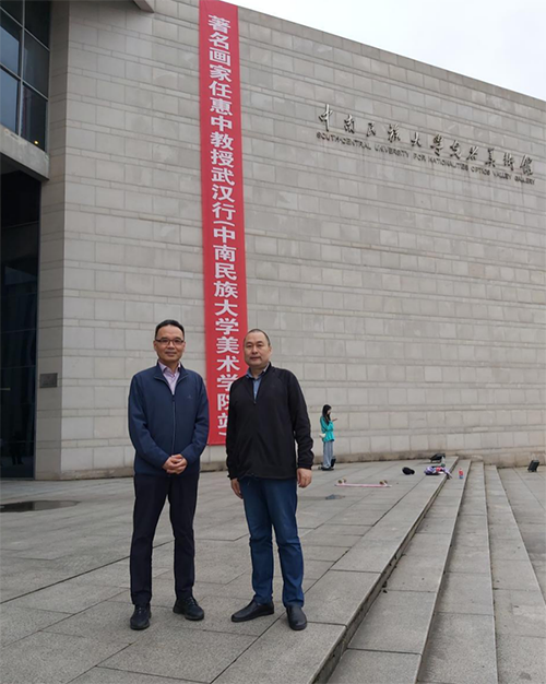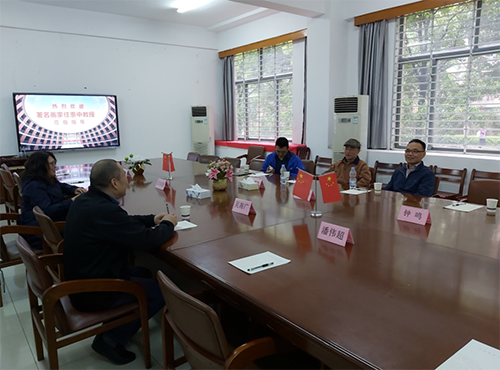 美术学院院长吴海广教授、副院长彭阳陵教授,绘画教研室主任潘伟超教授,徐敏教授,陈岱老师在美术学院大厅热情迎候了任惠中教授一行,并在院会议室进行了座谈
