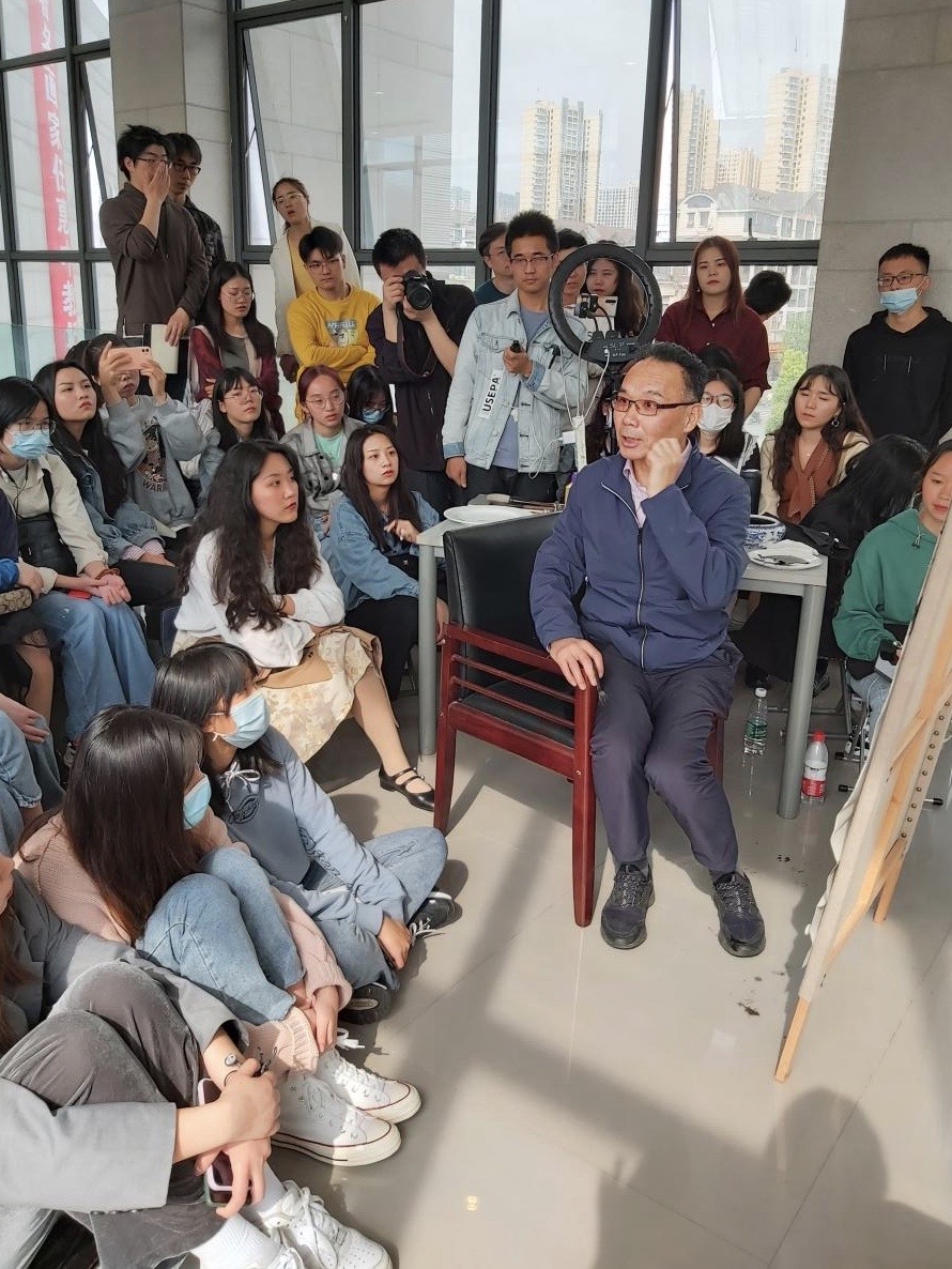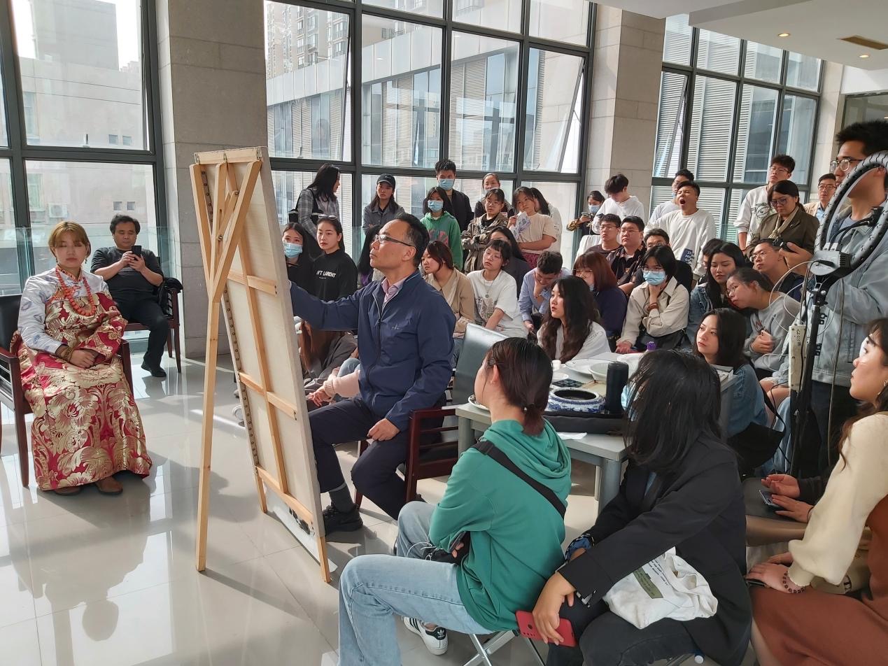 4月23日下午14:30,美术学院诚邀任惠中老师于光谷美术馆三楼开展水墨人物写生示范与师生交流活动。此次活动由美术学院副院长彭阳陵教授主持,绘画教研室主任陈雪亮老师,徐敏教授、陈岱老师莅临现场,绘画专业本科生和研究生全体参加。