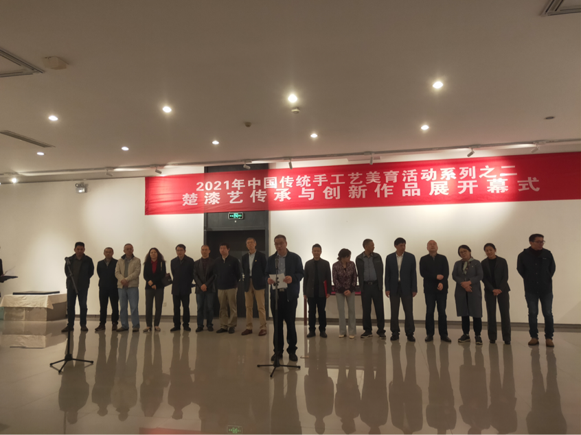开幕式上,美术学院党委副书记、院长、美术馆馆长吴海广首先致辞。他表示希望通过此系列活动,增强大学生的文化自信和文化自觉,以艺术之光铸造时代之魂。楚漆艺造型奇特诡谲、纹饰飞扬流动、色彩艳丽繁复,在南方艺术传统之中极具代表性。在此,向筹办此次活动的各位老师表示感谢,同时也向中国工艺美术大师刘比建先生和楚式漆器髹饰技艺传承人邹传志先生表示衷心的感谢。本次活动,一方面冀望为大家重现楚漆原貌,另一方面旨在传承与创新,期待为师生们提供一个更好的平台,增添交流的机会,开拓自己的艺术视野,吸纳创新,创作出更多的具有时代性的艺术作品。