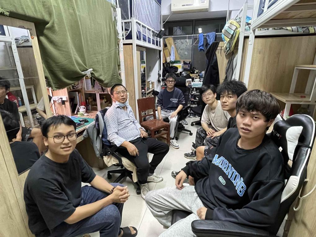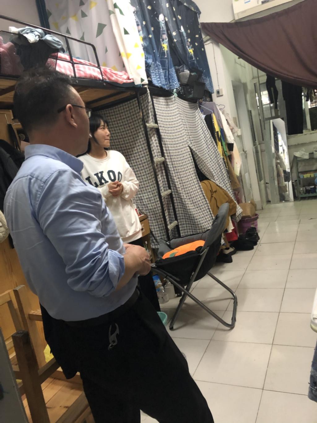 班导师在走访巡查过程中与同学们谈心谈话,了解寝室生活、学习情况,检查宿舍卫生、用电不规范现象,杜绝安全隐患。对寝室卫生情况较好、生活状态健康的宿舍进行肯定,并建议同学们在金色秋季里到校园内走走看看,放松心情、激发创作灵感;到跑道赛场上展开体育运动,增强体魄、呼吸新鲜空气。