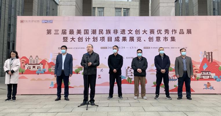 随后,美术学院院长吴海广致辞,吴院长感谢白书记莅临指导,感谢创新创业学院领导对最美国潮活动的大力支持和同学老师们的积极参与。他提到,民族高校肩负铸牢中华民族共同体意识的责任,强化学生民族文化传统的学习自觉,在创新实践活动中建立文化自信,根植传统文化基因,培根铸魂。“通过赛事活动强化学生课堂教学、课外创新、协同育人。根植优秀传统文化基因,提升大学生审美素养,陶冶大学生文化情怀,增强大学生的文化自信和学习自觉,以文化之光铸牢时代之魂。在此期待同学们创作出更多更好的作品,在其他的赛事中取得更好的成绩。”