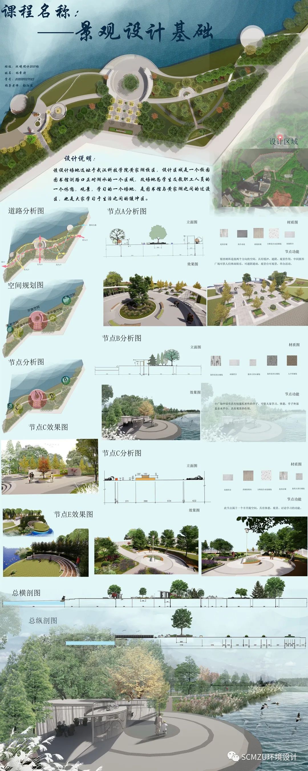 设计说明:该场地位于中国湖北省武汉市洪山区武汉科技大学的黄家湖校区。场地选址于校区内图书馆北入口前方,一侧正对图书馆的北入口,因此此出口前设置了景区主入口,能够有效增大场地人口流动和集散。分别是集散广场、滨水景观、亲水平台、学习空间、阳光草坪和树阵。保证基本能够满足学生学习和自习的需求,也可以在此处观水景和休憩娱乐。