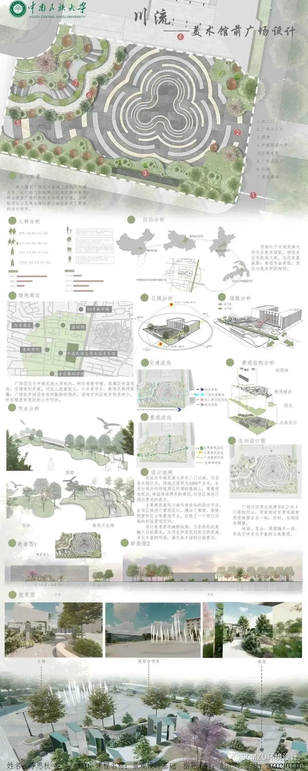 设计说明:简洁、大方、体现美院设计风格为基础,用绿化和建筑相辅相成,充分发挥美院广场功能,美化环境,创造意境