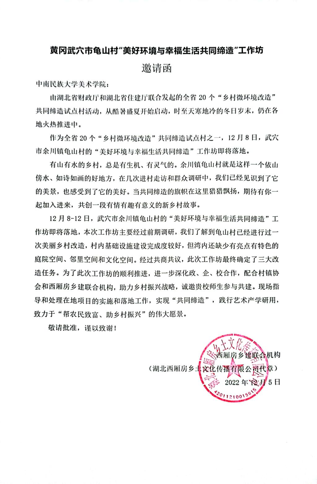 2022年12月5日,受湖北省村镇建设协会设计下乡(共同缔造)专委会邀请,知名设计机构西厢房乡建联合机构邀约,我院环境设计专业将组织师生共同参与黄冈武穴市龟山村“美好环境与幸福生活共同缔造”工作坊相关乡村微环境改造共建活动。