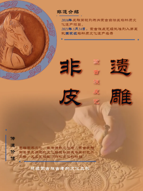 于若琼同学寒假参加了肖屏老师指导的“草原护卫队”社会实践,和队友们一起进行了国家级非遗项目蒙族“皮雕艺术”的实践活动。探访了博物馆、旅游市场及非遗故里--莫尼山非遗小镇,了解皮雕的制作工序,体验了非遗皮雕传承人的艰辛与不易,看到了他们身负重任却又不辱使命的工匠精神,在导师的指导下进行了考察报告的撰写及皮雕文创产品的设计,深刻感受到了继承和发扬传统 文化的重要性。(下图为“草原护卫队”团队文创作品)