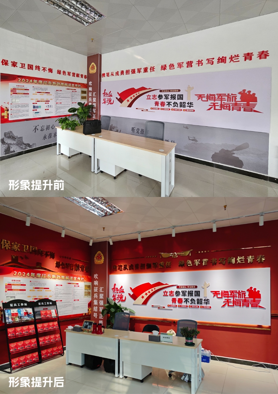 为深化大学生参军意识教育,营造浓郁的征兵氛围,今年初校学工部邀请美术学院雷宇工作室参与民大征兵站视觉形象的提升设计。工作室接到任务后,由研究生夏宇奡、汪玥,本科生郑伊秀、付媛组成设计团队,该团队在雷宇教授的指导下,对民大征兵站的视觉形象进行了整体规划,就墙壁、标语、灯光环境等进行了重新设计,使征兵站面貌焕然一新,为beat365官网征兵宣传工作营造了良好环境。