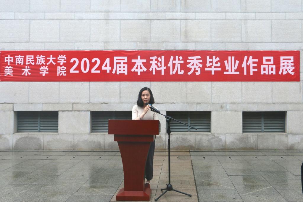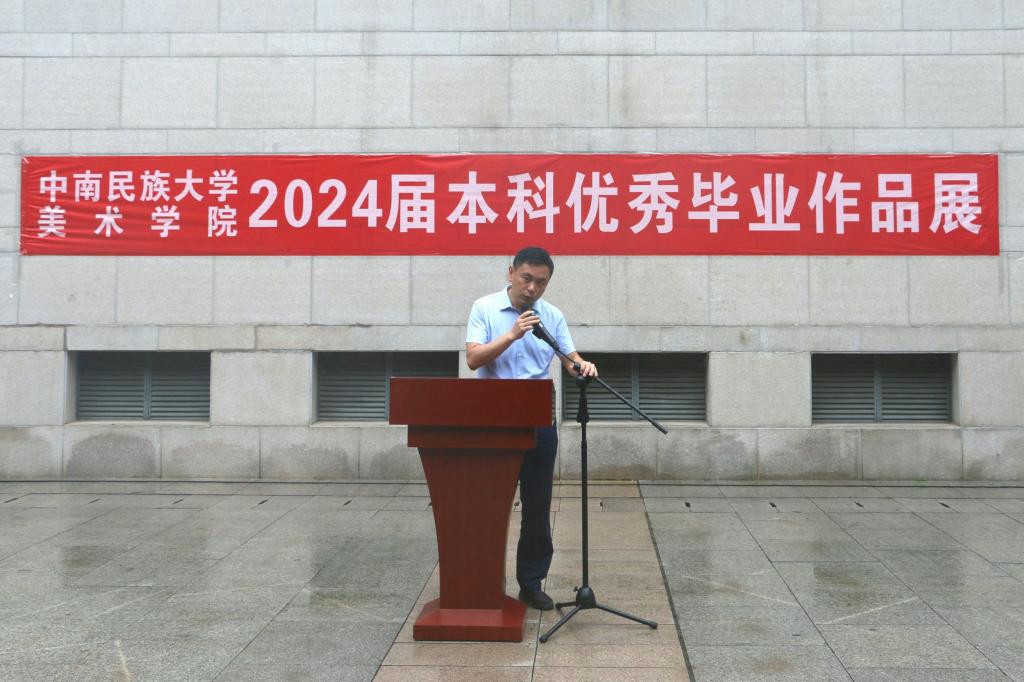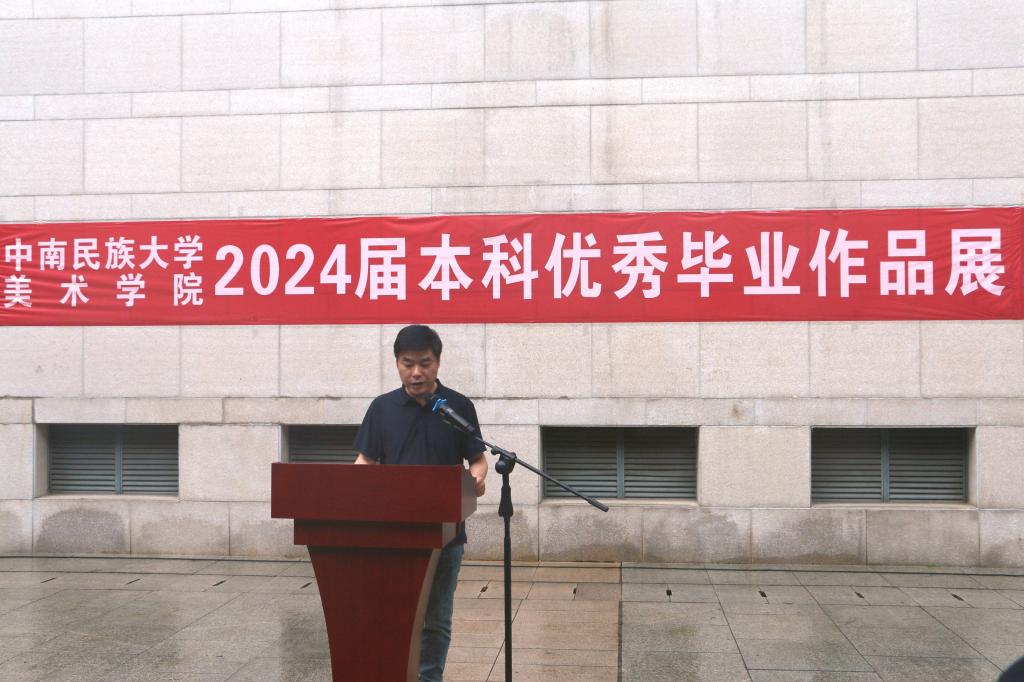 紧接着,院长吴海广教授发表了热情洋溢的致辞。他表示,五月是收获的季节,对于美术学院来说更是如此。吴院长回顾了学生们从四面八方汇聚南湖之滨,怀揣憧憬与期待,在学院“向善向美、立品立人”的院训下,接受宽口径、厚基础、重实用的教育,成长为创意实践、能力强大、高素质的应用型艺术人才。他称赞本次展览的每一件作品都是学生们辛勤努力的结晶,也是学校各部门和老师们无私奉献的见证。吴院长代表学院向2024届本科毕业生表示祝贺,他祝愿毕业生们未来前程似锦,继续保持对艺术的热爱和追求,在艺术的道路上不断前行。