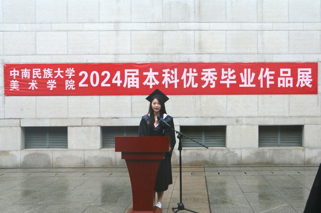 随后,来自环境设计专业的毕业生代表杜雨彤同学上台分享了自己在美术学院的学习和成长经历。她深情地回顾了在学院度过的美好时光,表达了对学院和老师们的感激之情。她表示,正是学院提供的优质教育资源和老师们的悉心指导,让她得以在艺术的道路上不断前行。她鼓励同学们珍惜在学院的学习机会,不断追求卓越,保持创新精神,为实现自己的梦想而努力奋斗。