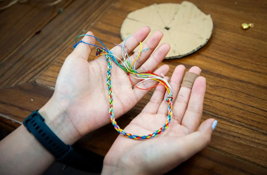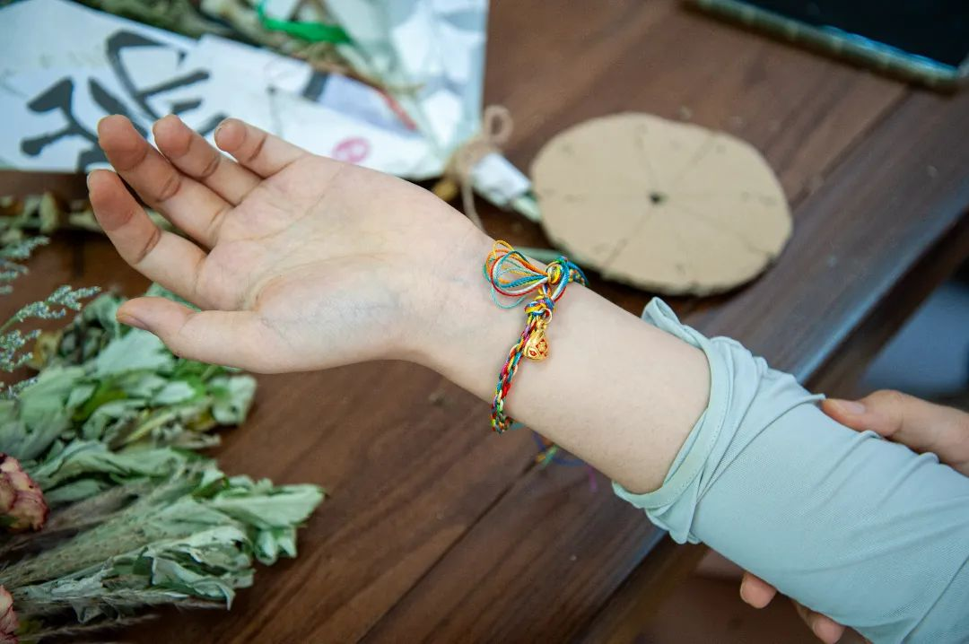 艾草花束制作完成后,团队成员向同学们介绍了五彩绳的寓意和编制方法,同学们认真学习,很快便编织出精美的五彩绳。绳索在指尖穿梭,每一种颜色都被巧妙地融入设计之中,形成了一幅幅动人的纹饰,这不仅是对视觉的享受,更是对手工艺术的传承与创新。端午佩戴五彩绳具有祈福纳祥、避邪驱灾的寓意,亲手制作的五彩绳无论佩戴在身上或是赠送给亲友,都将成为端午节传递祝福最好的心意。