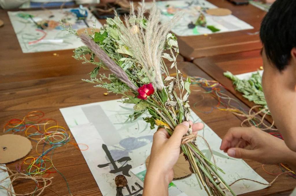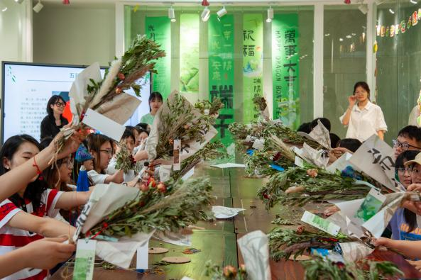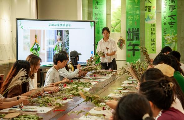 通过故事的讲解,同学们了解了白娘子的故事、端午的风俗等。接着,团队成员介绍了端午祈福纳祥的重要方式“挂艾”,展示了制作端午艾草花束的材料:艾草、仿真灵芝、各类干花、香包、书签等,示范艾草花束的制作方法。同学们纷纷动手实践,在巧手之下,材料开始逐渐组装成扇形花束,每一种植物都有其独特的位置和角色,在富有巧思的搭配下,花束显得既自然又有层次感,如同端午的文化深邃且丰富。现场气氛温馨而热烈,制作完成的艾草花束被倒挂于现场,现场洋溢着浓浓的节日氛围。
