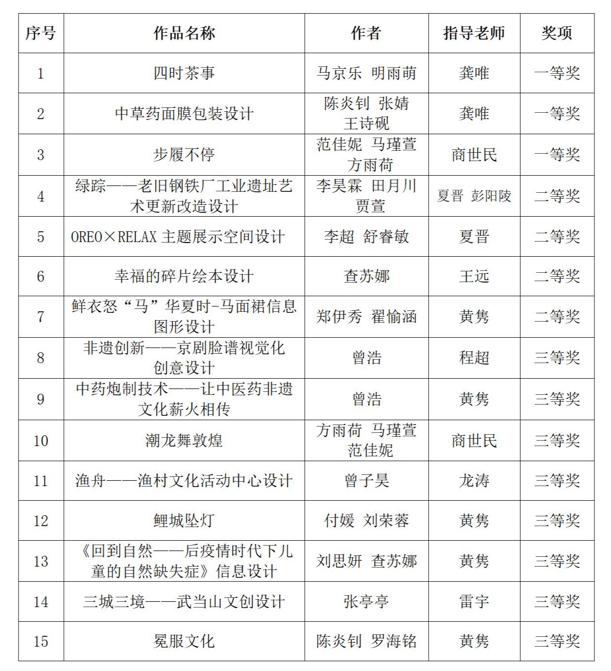 本届比赛的校赛由创新创业学院主办,美术学院承办。经过学生自主投稿、专家评审推荐,向湖北省分赛区选送150件优秀作品,分布在视觉传达、环境空间、文创产品设计专项赛、虚拟IP设计、传统美术、工艺美术等13个赛道。在省赛环节,经过激烈角逐,beat365官网选送的作品不负众望脱颖而出,有44件作品获奖,其中一等奖6项、二等奖14项、三等奖24项,获奖作品数量和质量均创历史新高。