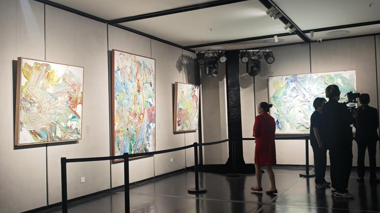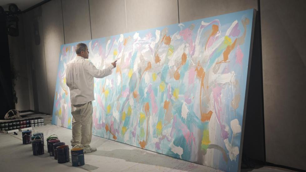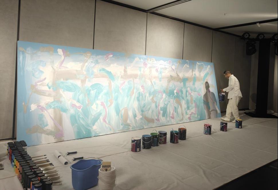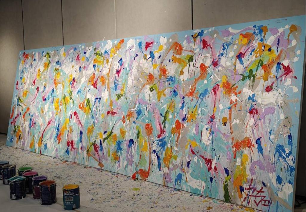 开幕式现场,法国艺术家JonOne进行了现场创作。面对画布,艺术家跟随音乐的节奏涂抹、滴洒色彩,不受任何形式的束缚,过程充满了激情、活力和意外。互动环节,艺术家JonOne向观众们解释到,此次创作灵感深受中国书法影响,通过学习书法的表现形式进行抽象创作。