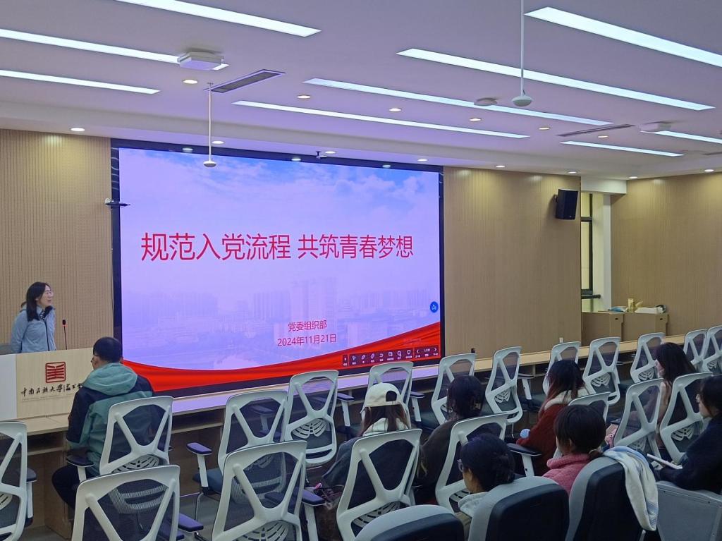 11月18日至11月22日,培训班组织学员集中听取了数场生动精彩的专题辅导报告,分别为院党委书记邹反修主讲的《铸牢中华民族共同体意识,争取早日加入中国共产党》;院党委副书记聂扬眉主讲的《中国共产党党规、党纪》;校党委组织部副部长谭雪霏主讲的《规范入党流程,共筑青春梦想》;23级辅导员赵锐主讲的《学习党的二十届三中全会精神》;24级辅导员向明锐主讲的《从中国共产党党史中汲取智慧和力量》。