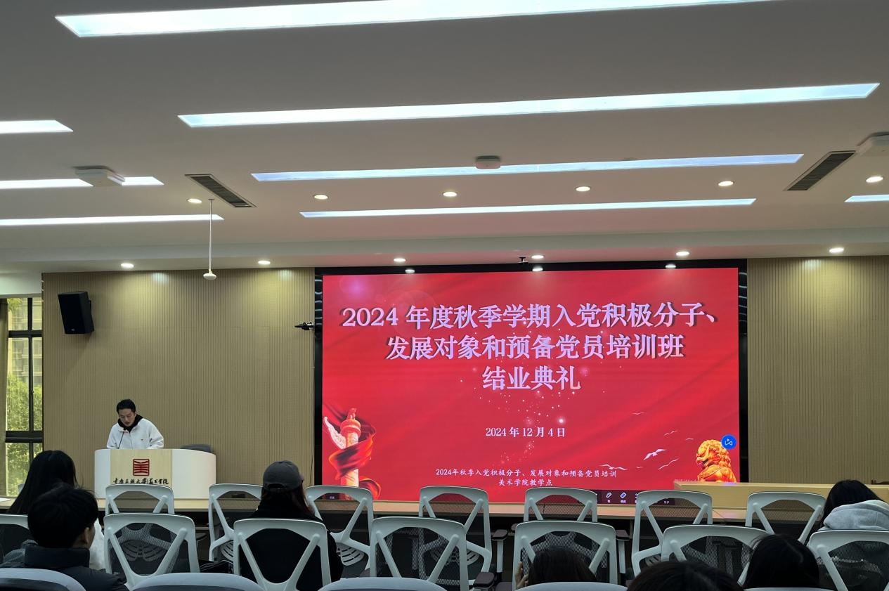 12月4日中午12:00,美术学院在美术馆三楼报告厅举行2024年秋季党校美术学院分党校培训班结业典礼,此次典礼由24级辅导员向明锐主持,院党委副书记聂扬眉及全体入党积极分子、发展对象、预备党员参加。聂扬眉宣读了对优秀学员的表彰决定并为优秀学员颁发荣誉证书,向顺利结业的学员表达了热烈的祝贺,对大家在培训中取得的成果给予充分肯定,并要求各位学员将这段时间的学习成果转化为实际行动,在各个方面以严格的标准要求自己,做到学思用贯通,知信行统一。