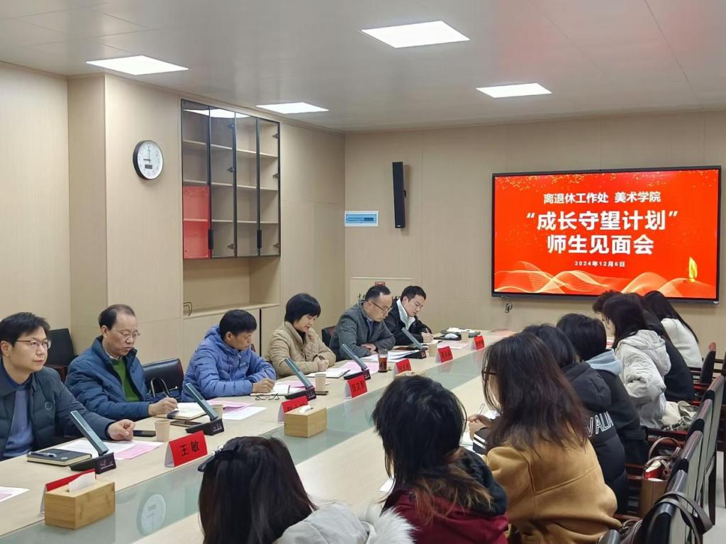 离退休工作处党委书记张文军、副处长赵小林、副处长王敏、党政办公室主任王莉娟、离退休服务科科长魏东、老年大学办公室主任胡蓉,以及美术学院党委书记邹反修、党委副书记聂扬眉、2024级辅导员向明锐,与“成长守望计划”的18名结对帮扶新生参加了此次会议。会议由美术学院党委副书记聂扬眉主持。