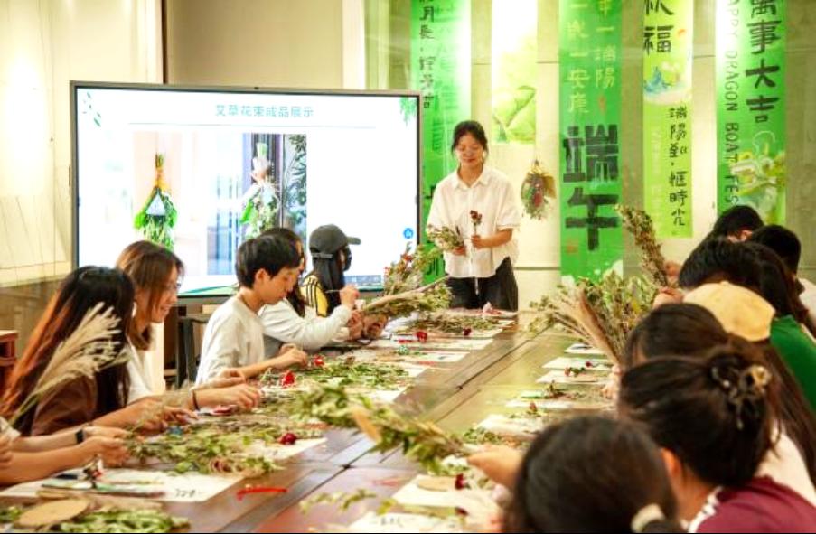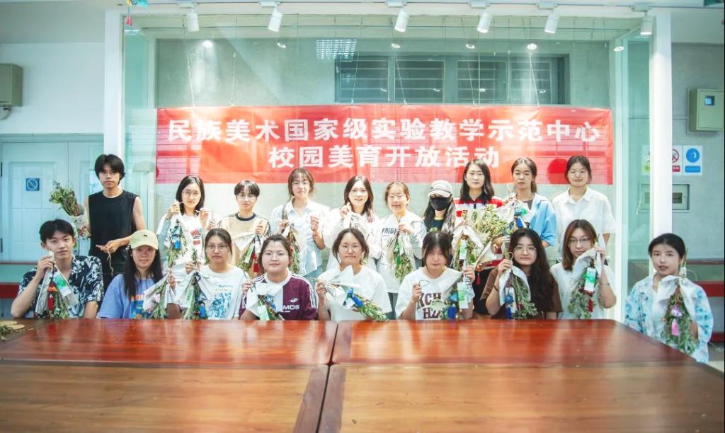 6月8日,端午佳节之际,美术学院联合党委宣传部、后勤保障处、国际合作与交流处、民族学博物馆等相关单位共同策划了端午文化节系列活动。示范中心开展了一场以木版年画“盗仙草”为主题的校园美育活动,姜小渊老师带领的“年画新说”团队带来了扎艾草花束、编织五彩绳等民俗体验,旨在融合非遗文化入实践,拓展校园美育新途径。