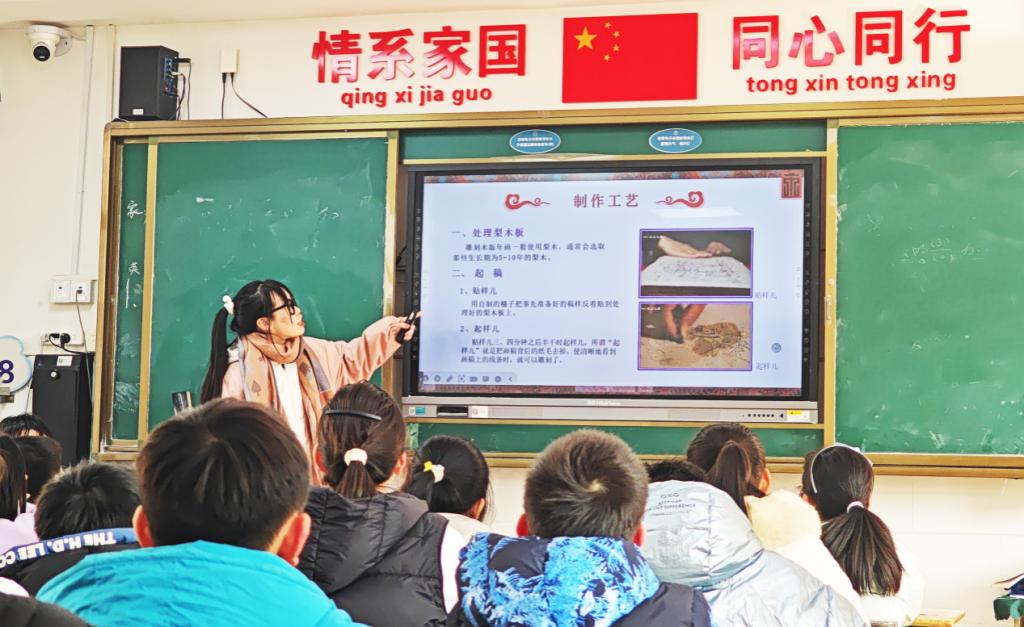 1月5日,示范中心在光谷实验小学开展“春联飞舞,年画入心”实验室开放活动。李广来老师带领小学生们挥毫泼墨,创作出一幅幅充满美好祝福的春联;“年画新说”团队现场示范年画制作,将年味带入小学课堂。