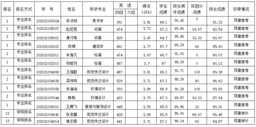 根据《beat365英国正版唯一网址推荐优秀应届本科毕业生免试攻读硕士学位研究生遴选办法(修订)》(民大教学〔2016〕12号)和《美术学院2024届本科生推免工作实施细则》,我院遵循公开、公平、公正的原则,经学生个人申请,学院对申请免试攻读硕士学位的2024届毕业生经过报名资格审查、学业成绩核算、奖励加分认定、综合测评考核等环节工作,并经学院党政联席会研究决定,现将美术学院2024届本科生推免结果公示如下: