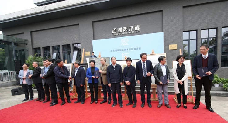 2020年10月25日上午10:30,由湖北省美术家协会、汤湖美术馆联合主办的“宏拓——湖北高校院长美术作品邀请展”开幕式于汤湖美术馆西大门广场隆重举行。开幕式由江汉大学美术学院副院长、汤湖美术馆副馆长柳国良主持,我院院长吴海广教授应邀参加画展并出席开幕式各项活动。