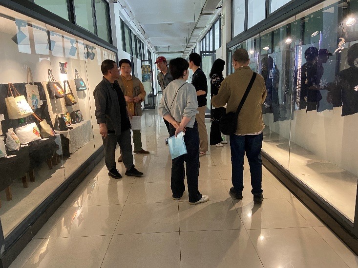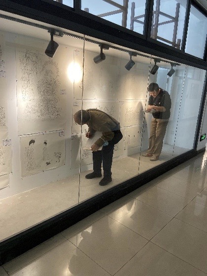 在二楼2020届绘画二班展示区,专家组成员首先检查了由姜小渊老师承担的《民族民间美术》课程和徐敏老师承担的《线描》课程的作业成果展示。两位老师仔细向专家组成员介绍了本课程的教学目标、作业要求和每位学生的作业完成质量分析,评分组专家在任课老师的引导下,饶有兴致的观赏了布贴工艺品、蜡染和古代工笔线描临摹三个展柜的近70余件展品,并根据展示效果和任课老师的意见,对每位学生的课程作业进行打分。