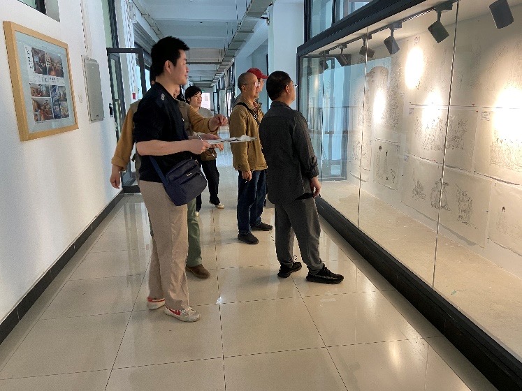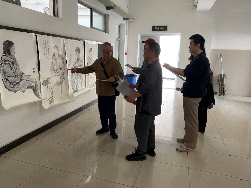 在五楼的2018届国画班和2019届绘画1班作业展示区,专家组成员先后检查了《专业考察》、《水墨人物写生与创作》、《艺用人体解剖》、《人体速写》四门课程的结课作业展示,详细听取了罗彬、陈雪亮、孙伟和陈岱四位任课老师对各自课程的教学、作业指导和展示安排的介绍。随后,专家组根据实际展示效果和作业完成的数量和质量,并参考任课教师建议,给每位同学都出了合理的分数。