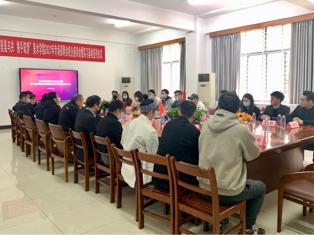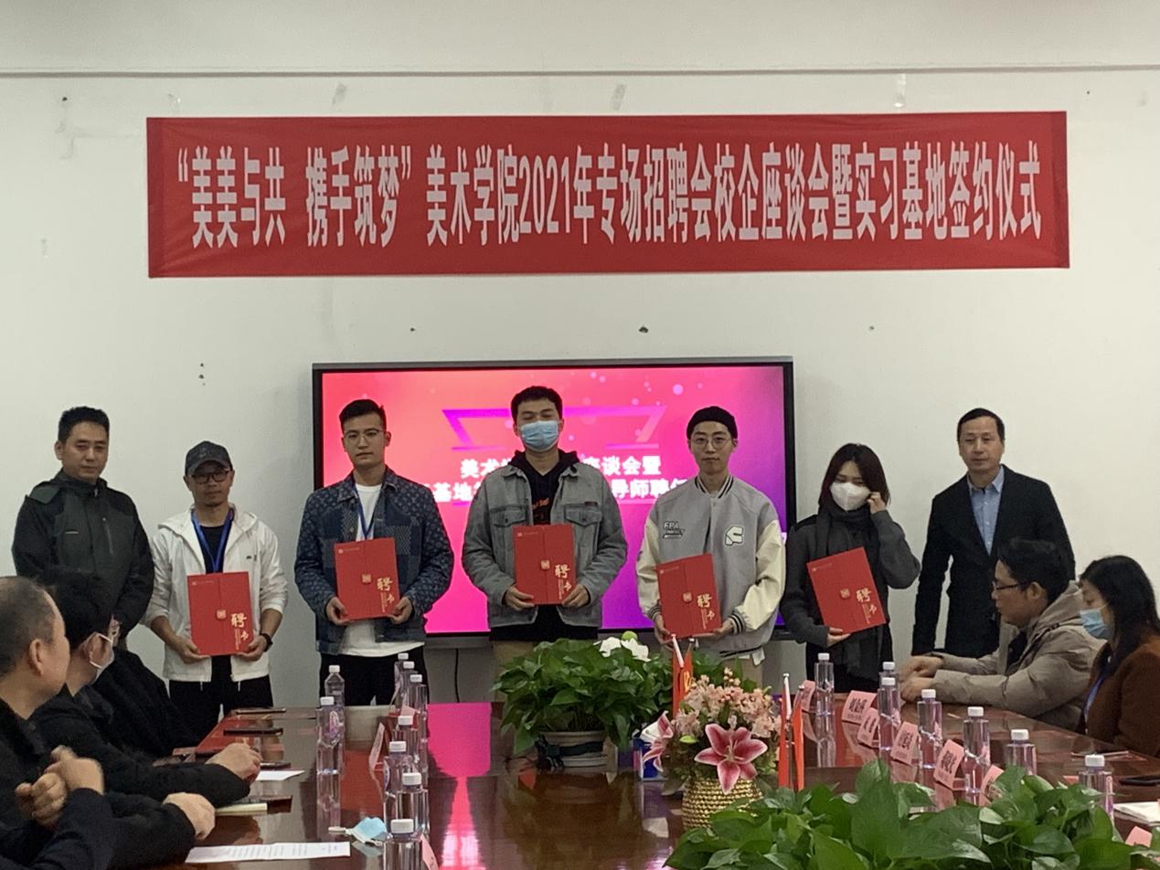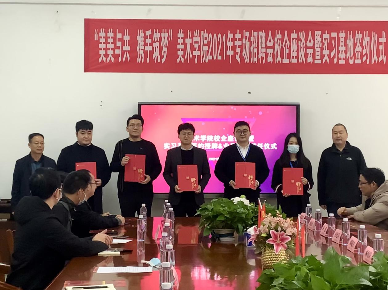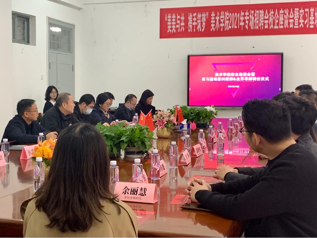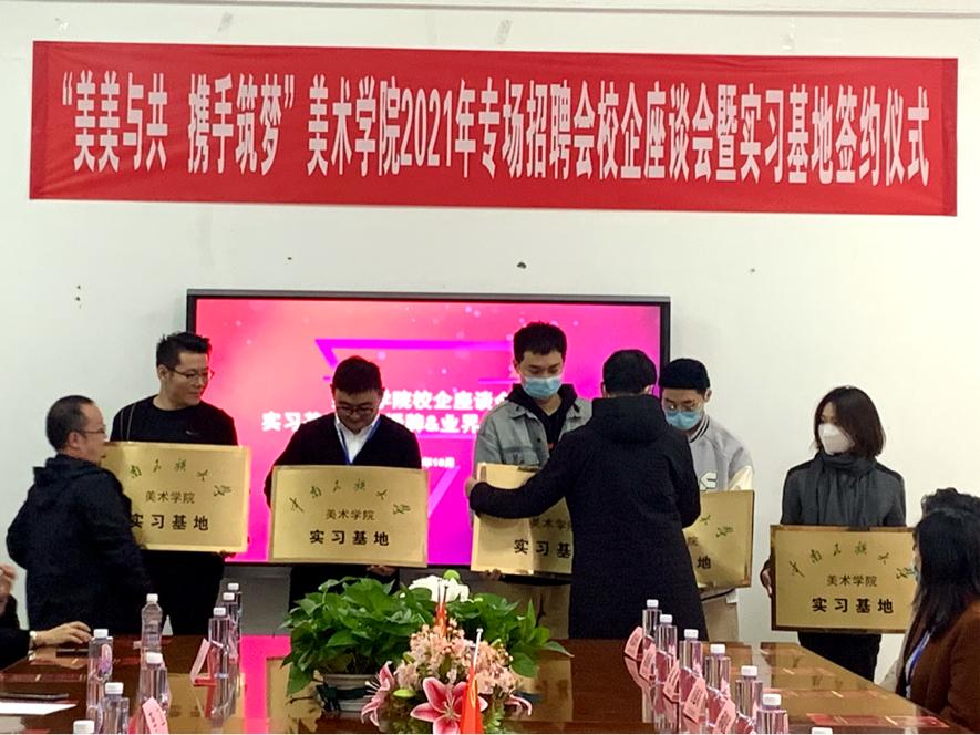2021年10月22日下午,由beat365英国正版唯一网址美术学院主办,学校招生就业工作处承办的第二届“美美与共,携手筑梦”主题2021年专场招聘会在美院圆楼圆满举办。招聘会后举行了美术学院2021年专场招聘会校企座谈会暨实习基地签约仪式,仪式由美术学院教学院长彭阳陵主持,参会人员有:招聘企业公司代表,招就处领导潘宏飞,教务处领导李立,院长吴海广,副院长程超和教研室各主任们一同出席。
