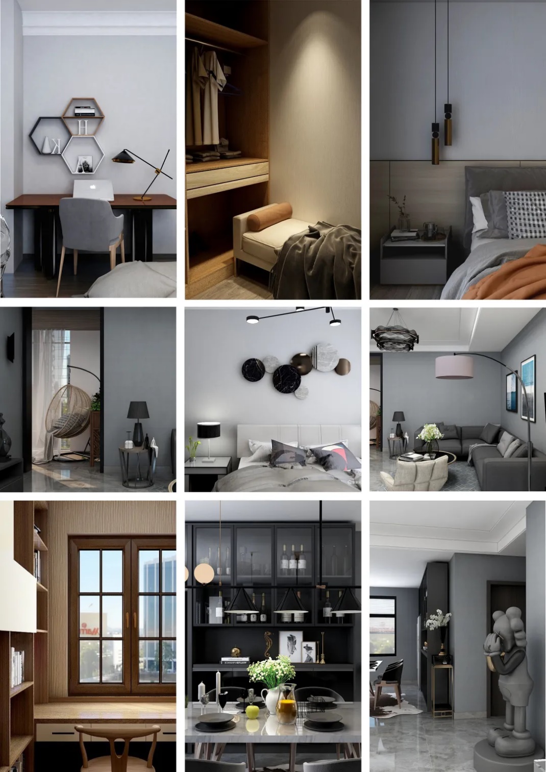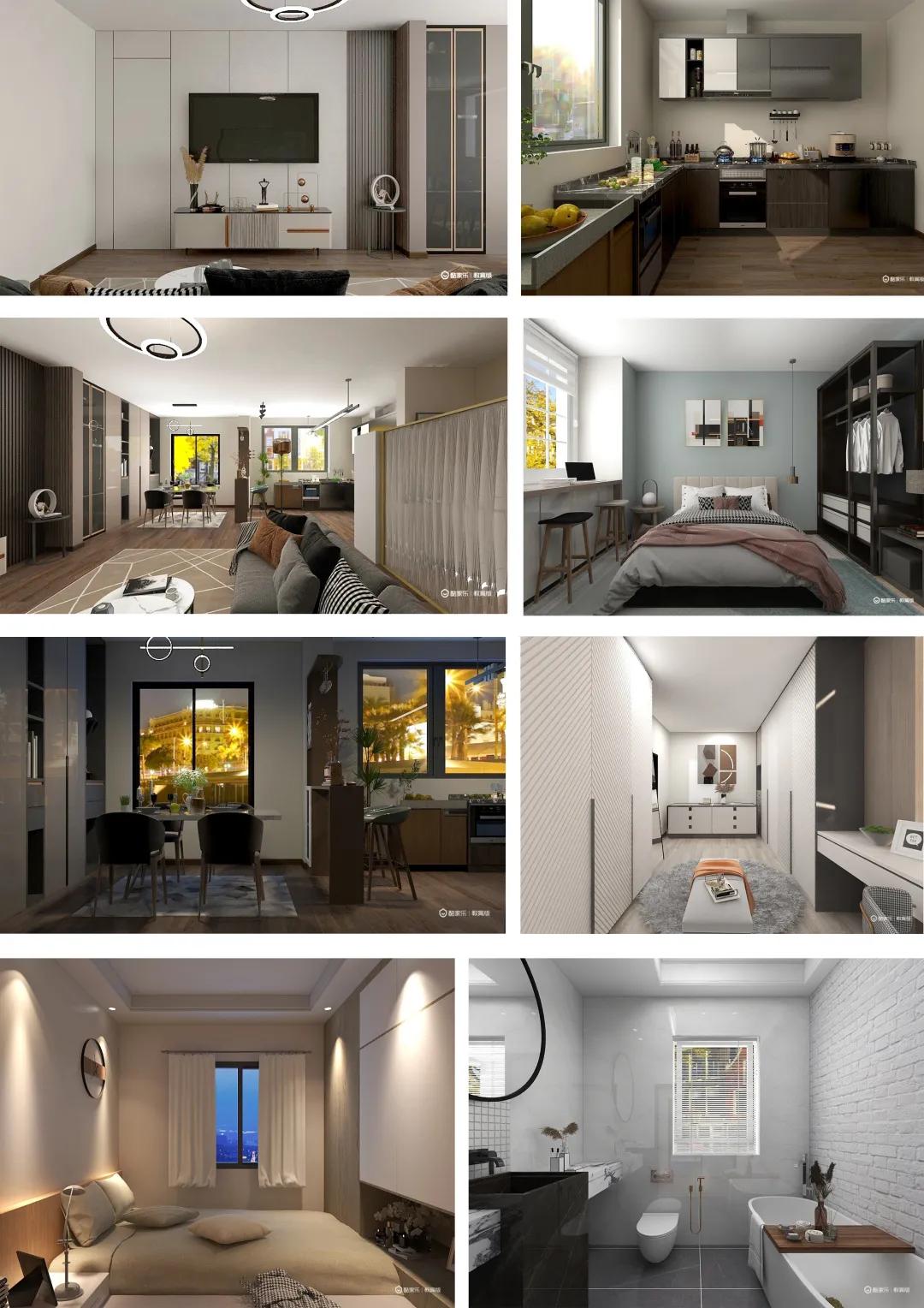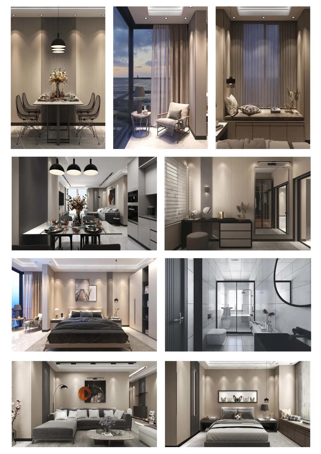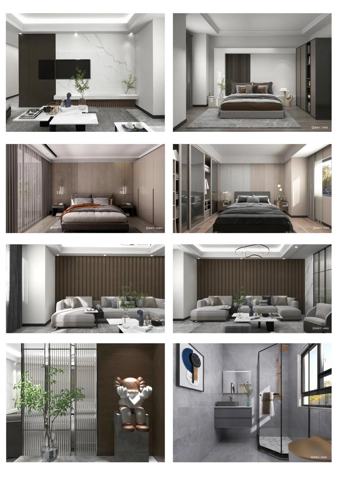 我针对的是现代都市年轻人群,所以我选择的是现代轻奢风格,整屋的色彩主要是黑、白、灰、棕色。整个空间主要是简洁的、硬朗的直线条,选用平滑的门板造型,简单的墙板等没有过多的雕刻修饰,黑白对比明显。软装方面采用了舒适、质感细腻的绒皮,与周围硬朗的线条形成鲜明的对比。
