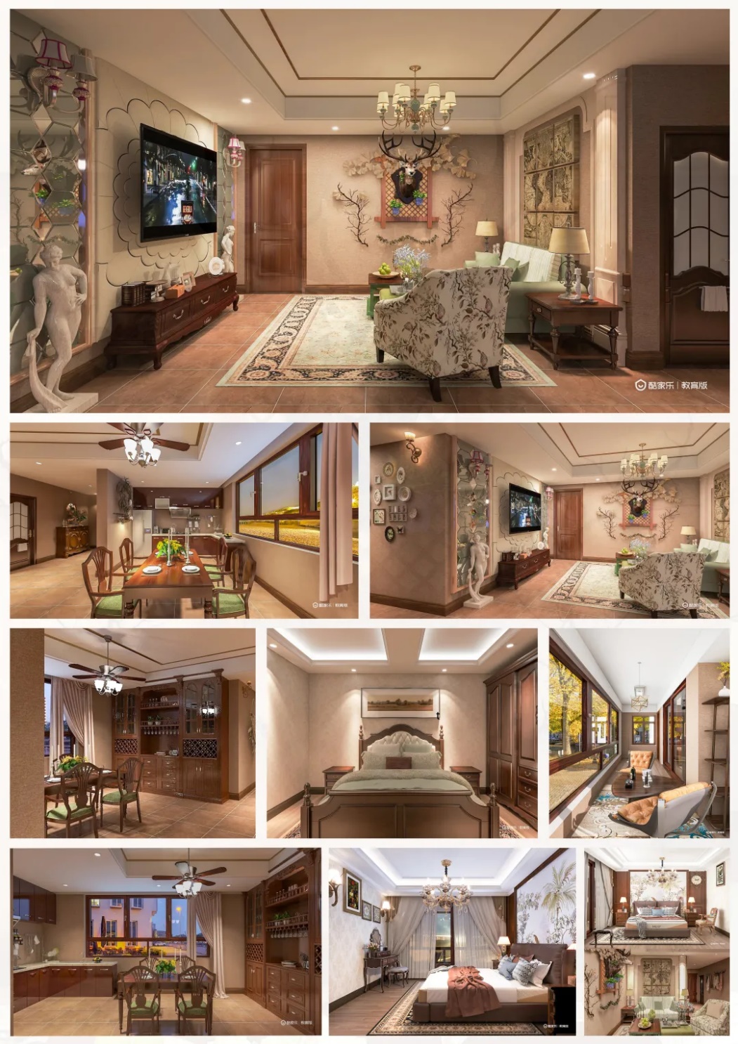 本案设计是围绕美式风格为主题,适合户主及其三代人的家庭居住。美式风格已经大行其道几年了,仍然保持很猛的势头,这是因为人们装修时总希望舒适、实用的同时,体现一定的艺术品味。而美式风格不仅注重舒适感和实用性,而且还体现出了现代社会生活的精致与个性,符合现代人的生活品味。我希望当户主及其家人回到家身心就进入一种彻底放松的状态。所以本案设计的中心理念就是生活要以休闲为主。经过考虑,在设计过程中我选择在总体布局上采颜色柔和的乳胶漆,来代替冰冷的白墙,屋顶和墙面的颜色也做了专门区分,增加层次感。厚重又复古的家具,粗犷的线条奠定了美式风情。在整个色调中家具地毯配饰都以低饱和度为主,但色相上会去做一些克制的对比,黄色大理石地板和绿色的沙发使美式不再中规中矩,并且为了在氛围中融入更多的文艺情怀,我使用了许多美式传统的小饰品来点缀,让整个空间呈现出一种温馨感。